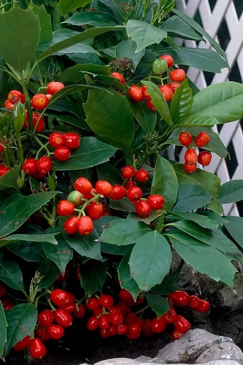 When it comes to Aucuba, commonly known as Japanese Laurel, we gardeners often think of lush, bold and lustrous foliage that brings a look of the tropics to the landscape, rather than how nice the large red berries can be. Reason being, it’s the female plants that produce the berries and a male plant is usually needed as a pollinator. However, with ‘Rozannie’, both male and female flowers are present. This makes her a self-fertile variety that will freely produce abundant clusters of large red berries on her own. From clusters of small reddish-purple flowers that appear in spring, Rozannie produces unusually large red berries that stand out remarkably well against shiny, leathery, sword-shaped, evergreen leaves. Since the birds, deer and other animals don’t feed on the berries, they often last through the winter months. At 4 feet tall and maybe a little wider when all grown up, Rozannie is a good fit in smaller spaces and home foundation plantings, and also makes a fine, natural evergreen hedge or grouping in deep shade to part shade. Keep in mind she doesn’t like the afternoon sun, which can cause scald her leaves. Hardy in landscapes as far north as USDA 6, where temperatures can drop -10F, and also as far South as Miami! Also excellent for containers that can be situated outdoors or indoors as a year-round houseplant.